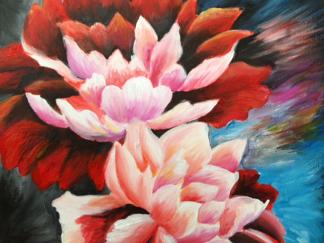 Acrylic painting: lovers in front blooming